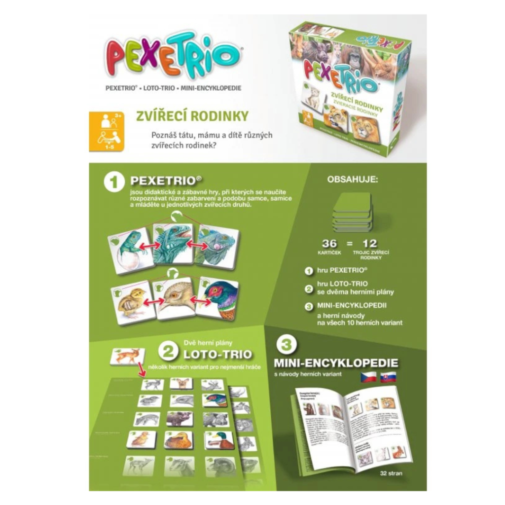 Součástí jsou odolné kartičky a také hrací arch pro doplňkové hry LOTO-TRIO a nabízí několik variant