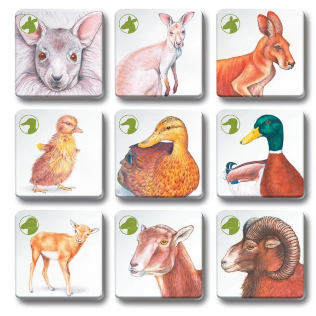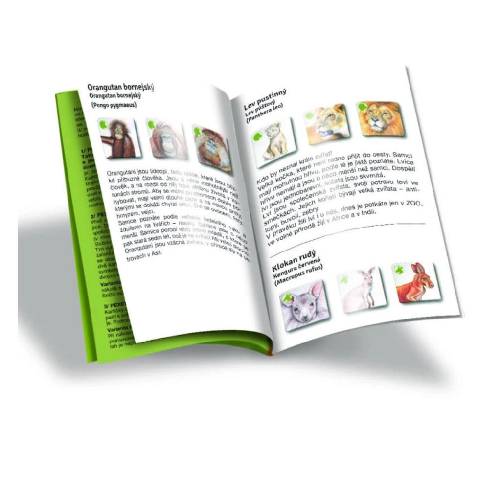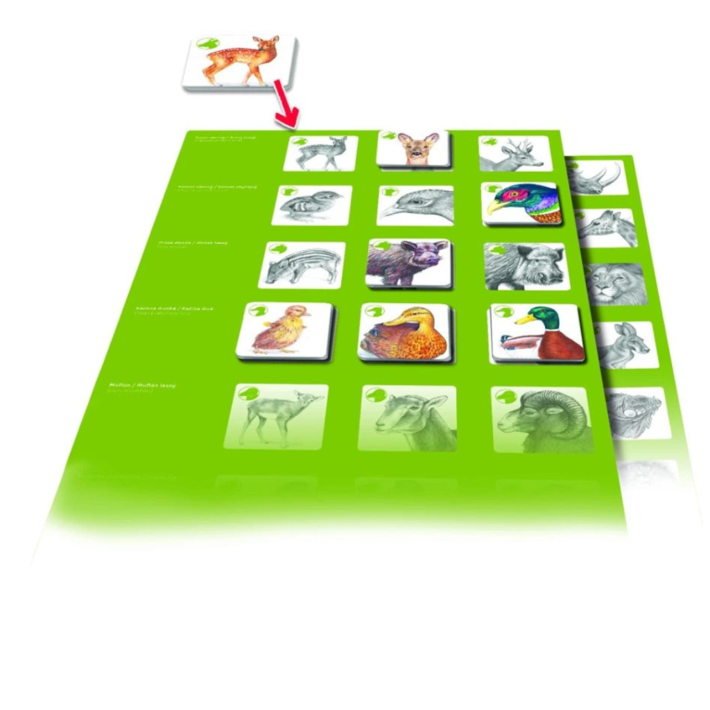 🌏Hra podporuje nejen rozšiřování znalostí, ale také rozvoj logického myšlení a paměti. Úkolem je správně najít trojice kartiček, které k sobě patří – samec, samice, mládě.