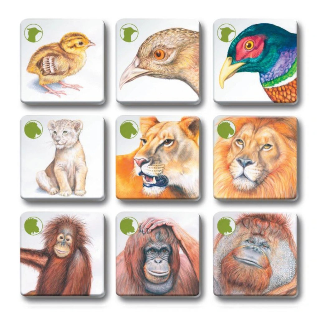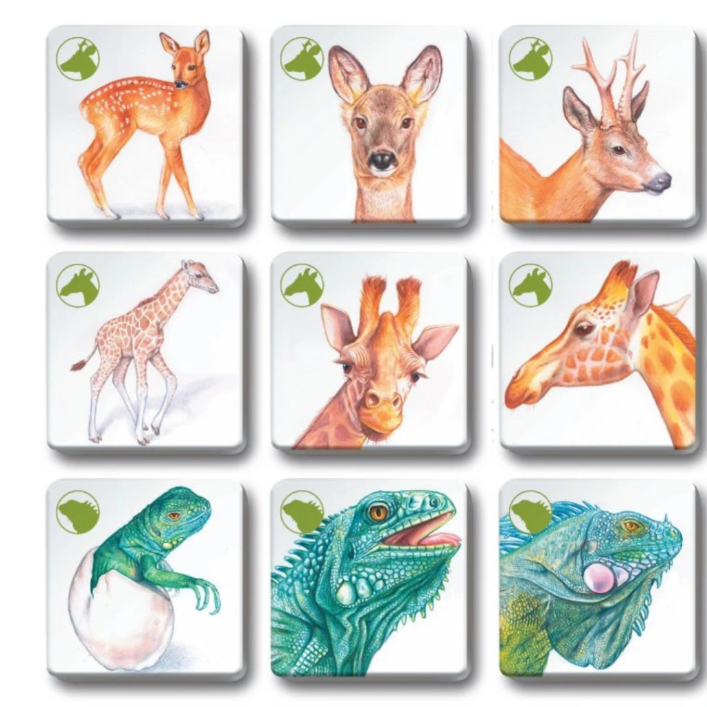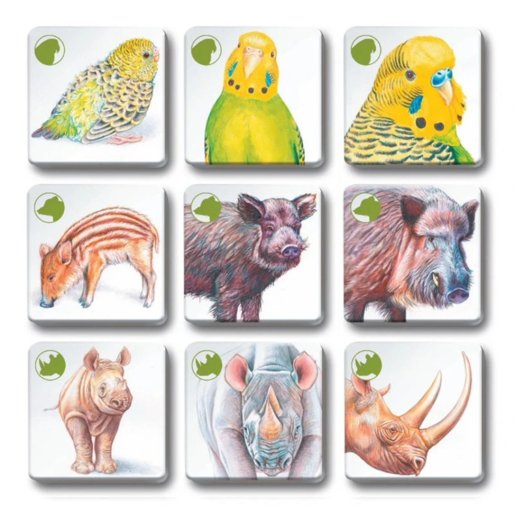 🌏Hra podporuje nejen rozšiřování znalostí, ale také rozvoj logického myšlení a paměti. Úkolem je správně najít trojice kartiček, které k sobě patří – samec, samice, mládě.