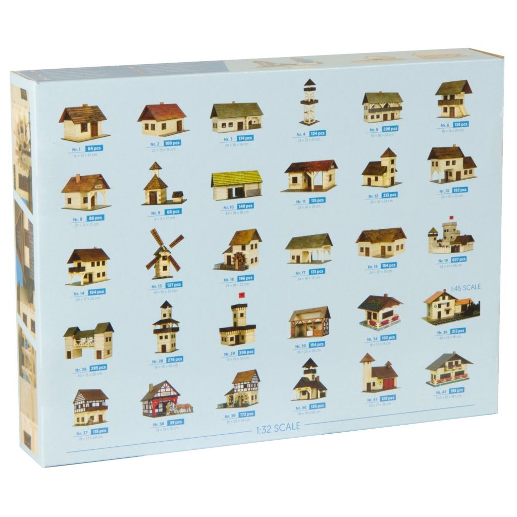 Stavby se slepují lepidlem na dřevo a papír (není součástí balení), ale můžete jej zakoupit u nás ve výtvarných potřebách. Modely staveb jsou v měřítku 1:32.