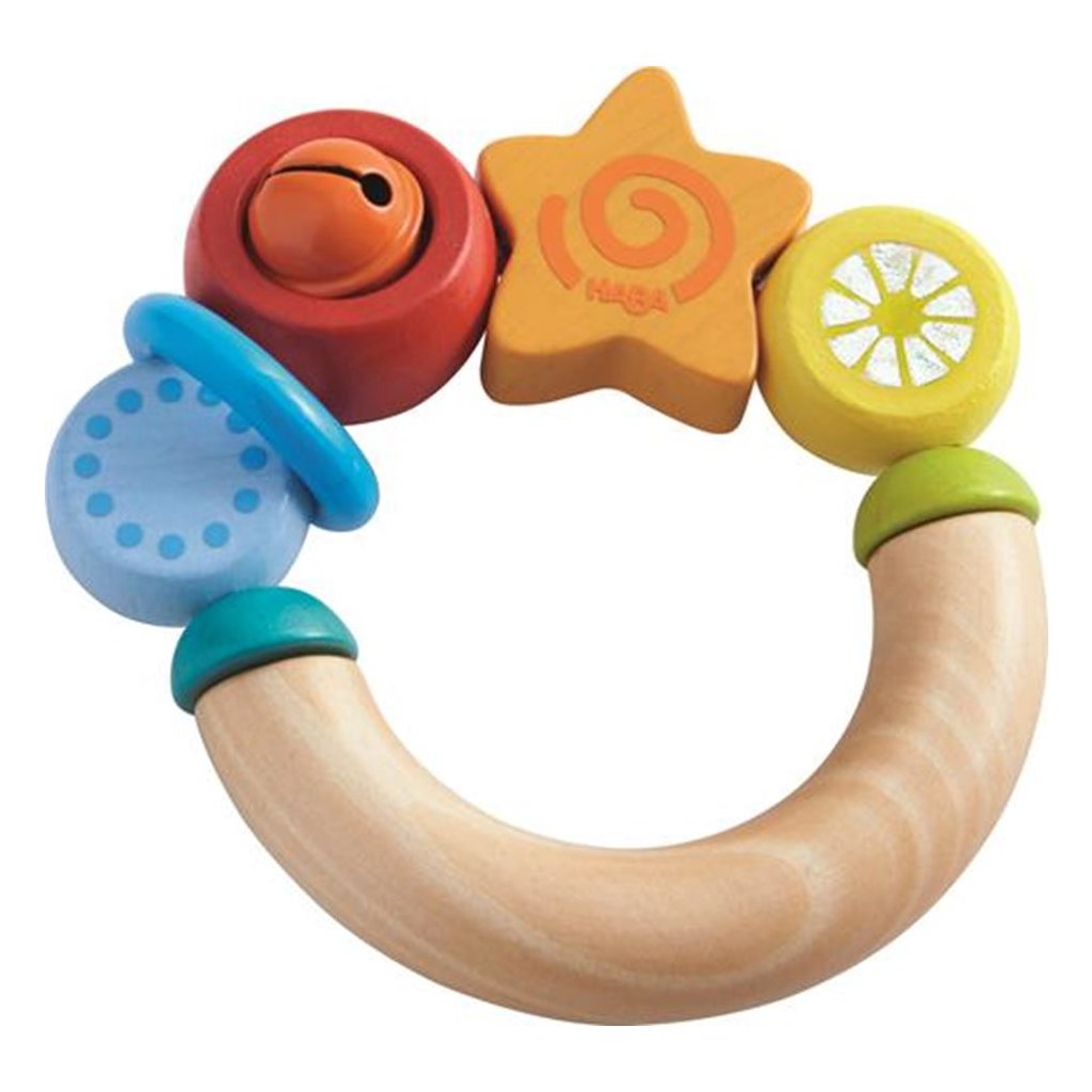 Dřevěné části chrastítka jsou navlečeny na gumičku. Z jedné strany je pevně připevněn zvonek, který při třesení vydává jemný zvuk. Hračka je vyrobena z bukového dřeva, mořeného netoxickými barvami.