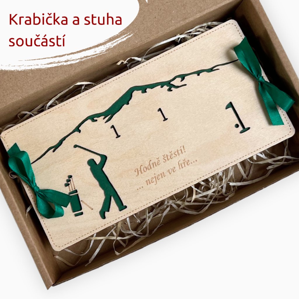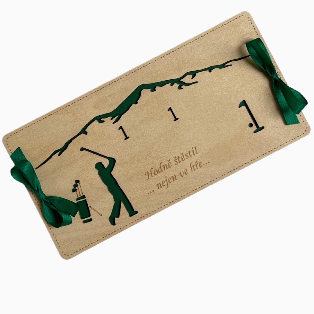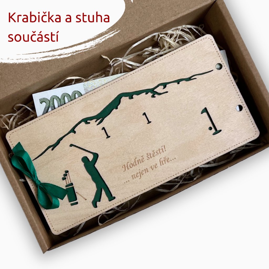 Dřevěné pouzdro na peníze - GOLF krabička a stuha součástí