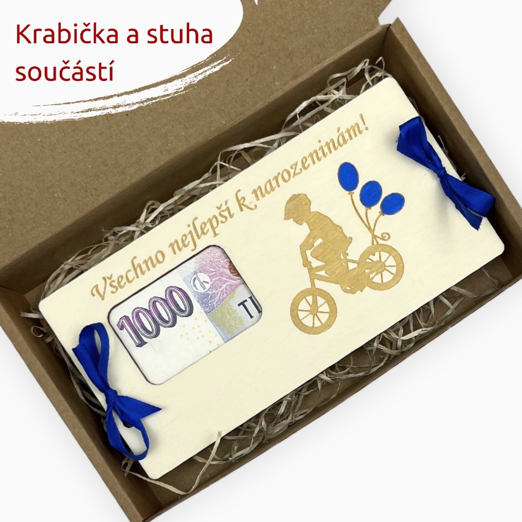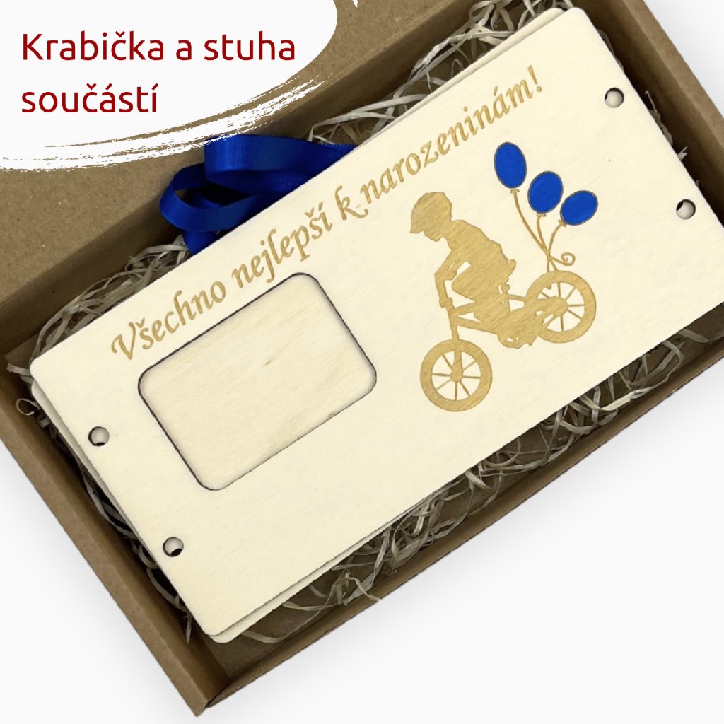 Vyberte si naše dřevěné pouzdro, do kterého vložíte bankovku nebo třeba vstupenku na oblíbené představení. Toto pouzdro je pro chlapečka, ale v nabídce najdete i obdobné pro holčičku.