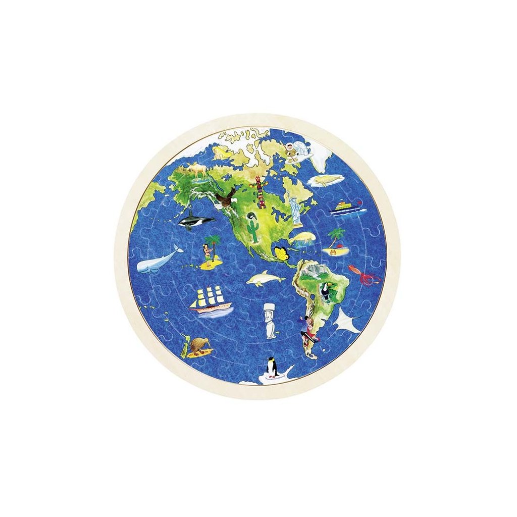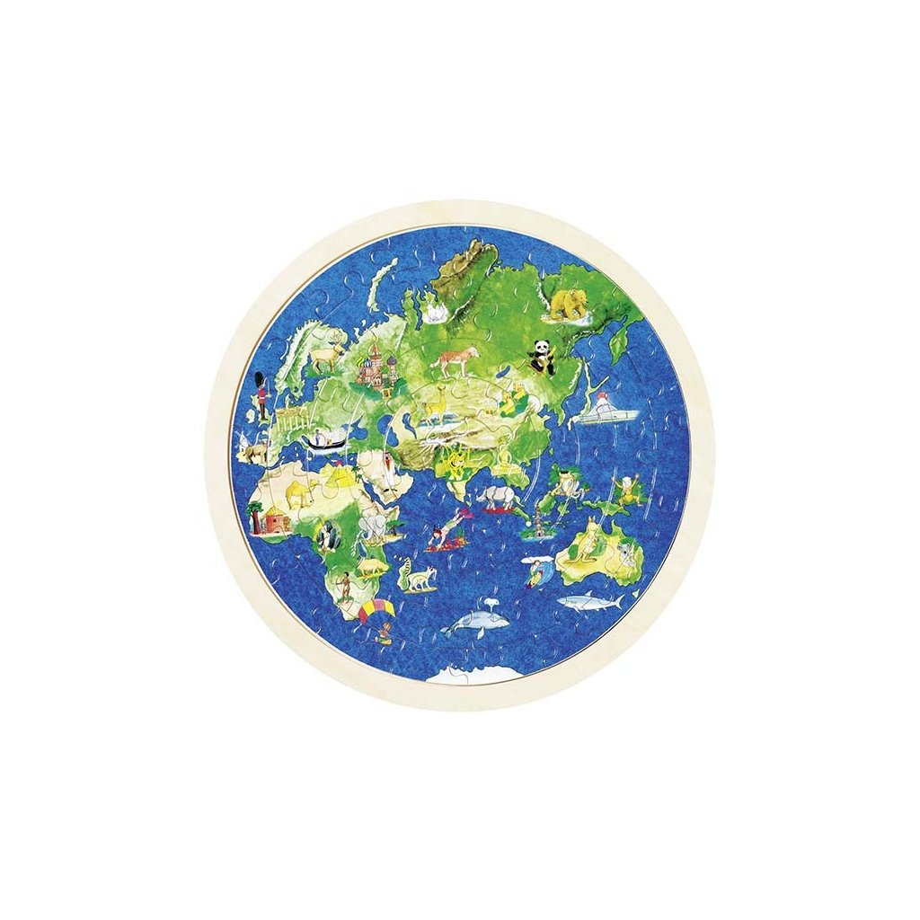 Oboustranné puzzle zeměkoule se skládají z 57 dílů, které se vkládají do dřevěné kulaté desky.