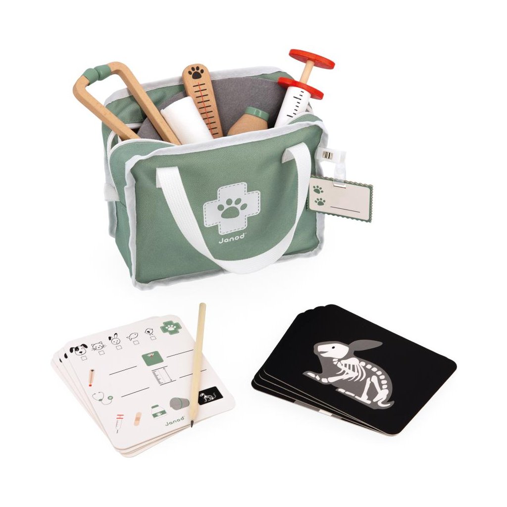 Veterinární kufřík obsahuje 15 doplňků: 1 odznak, 4 kartičky na předpis, 4 rentgenové snímky (králík, kočka, ryba a zlomená kost), 1 obvaz, 1 plstěný obojek a 4 dřevěné doplňky: stetoskop, injekční stříkačka, teploměr a hrnec smetany.