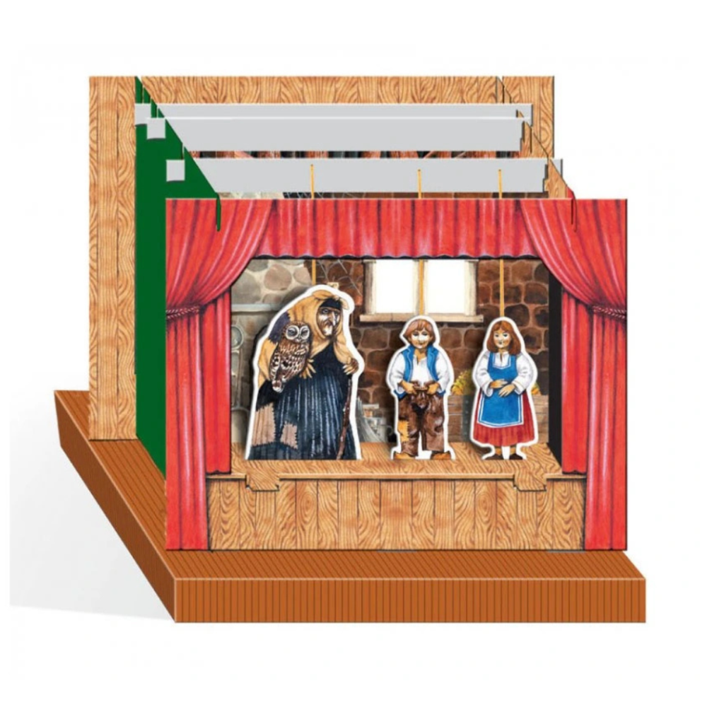 ⭐Sestavení divadla je rychlé a jednoduché díky připraveným kartonovým dílům. Loutky stačí vyloupnout z kartonu a zasunout do nich vodicí špejle – během chvíle můžete začít hrát.