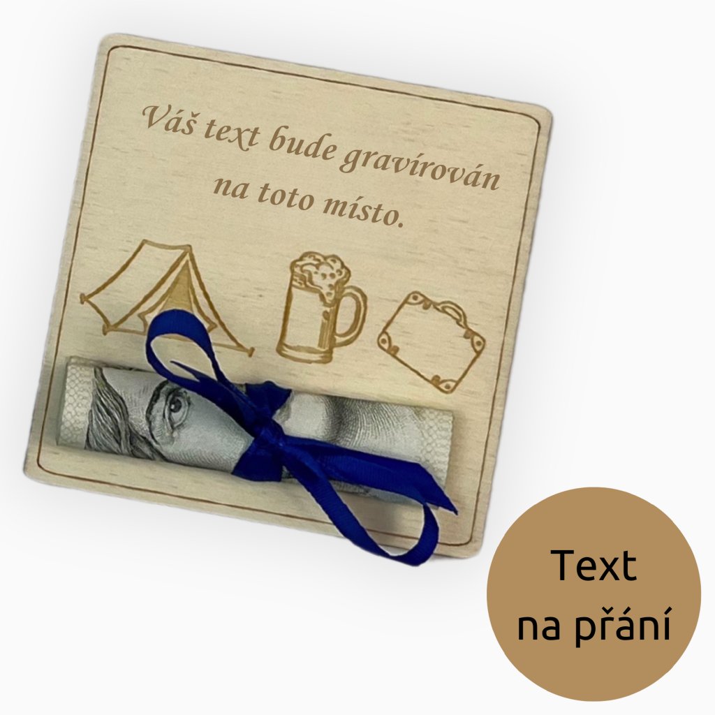 Kartu na peníze zasíláme v kraftové papírové krabičce bez potisku s dřevitou dekorační výplní. Stuha k přivázání bankovky ke kartě je součástí výrobku. Bankovky nejsou součástí výrobku :-).