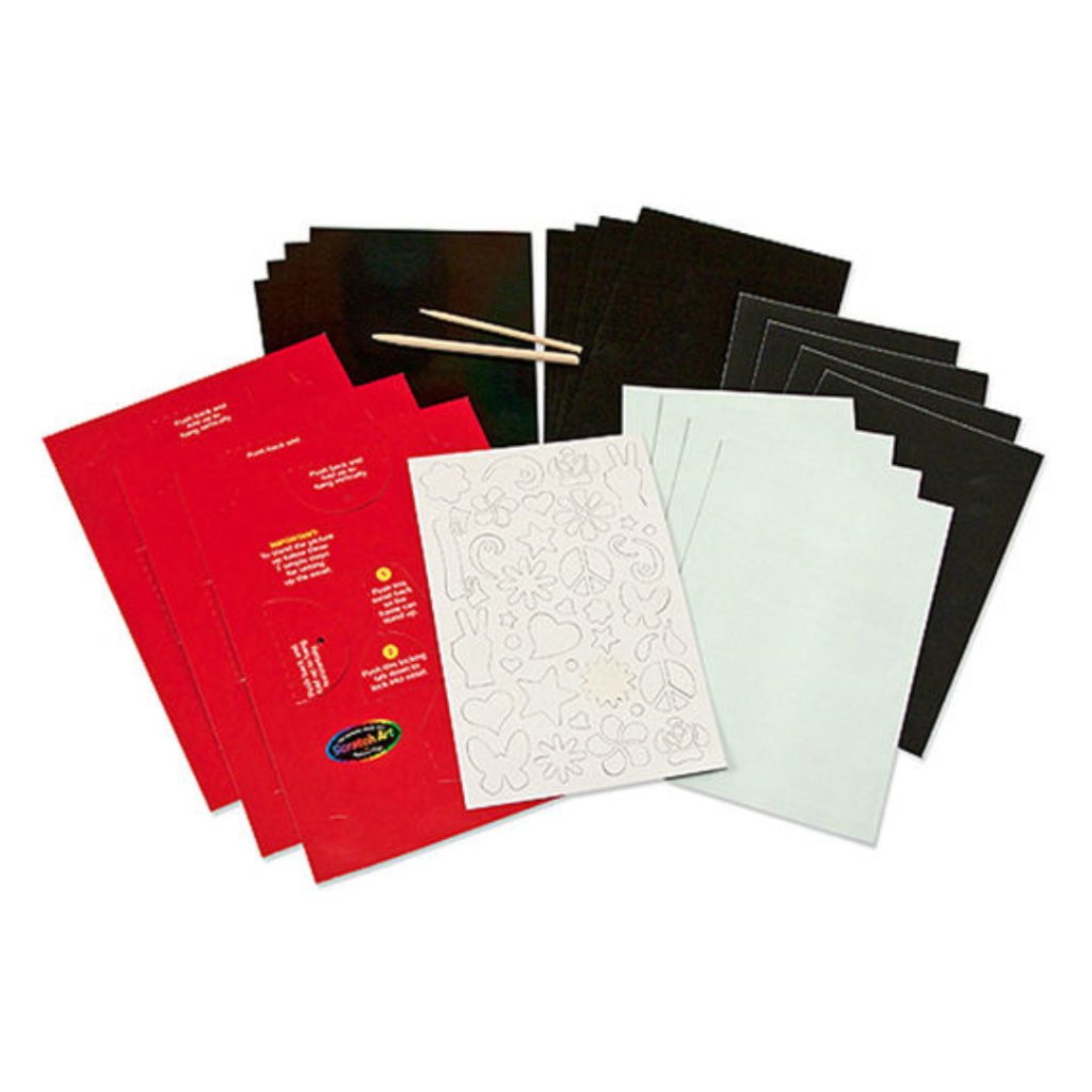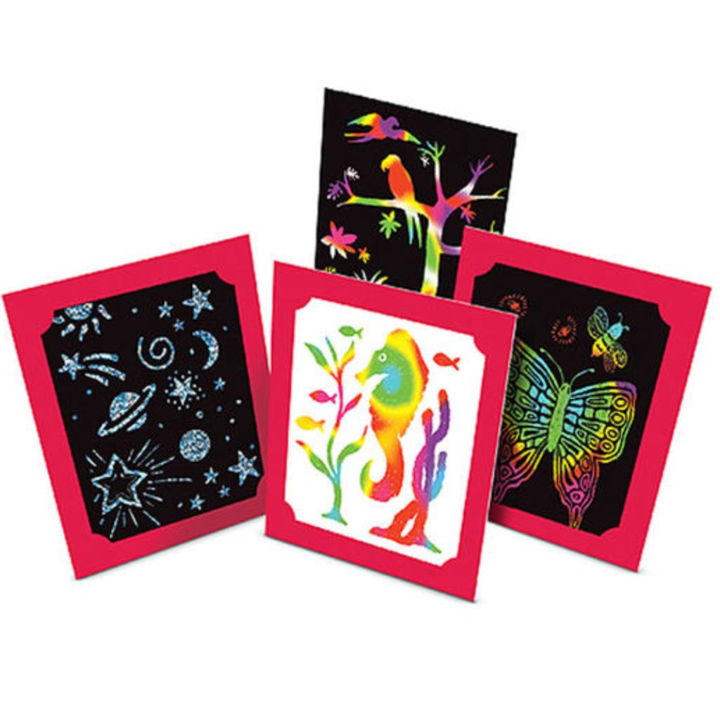 To nejlepší ze světa vyškrabování v jedné velké sadě! Malí umělci si mohou vytvořit až 16 parádních obrázků na barevném podkladu – podle vlastní fantazie nebo s pomocí přiložených šablon. Stačí jen vyškrabávat a sledovat, jak se pod rukama objevují duhové, zlaté nebo třpytivé vzory.